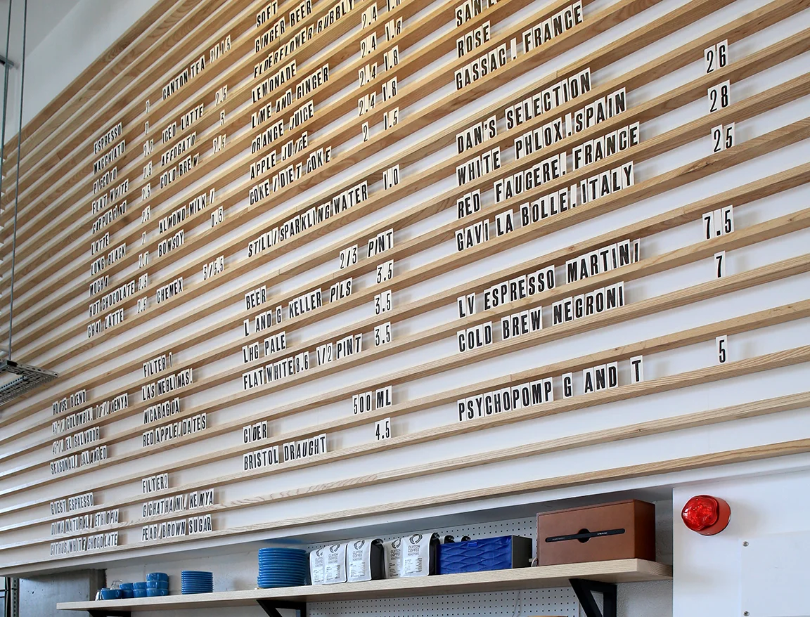 Little Victories is a coffee shop in Bristol where the menu was designed as a full wall display using an individually letterpress printed alphabet.