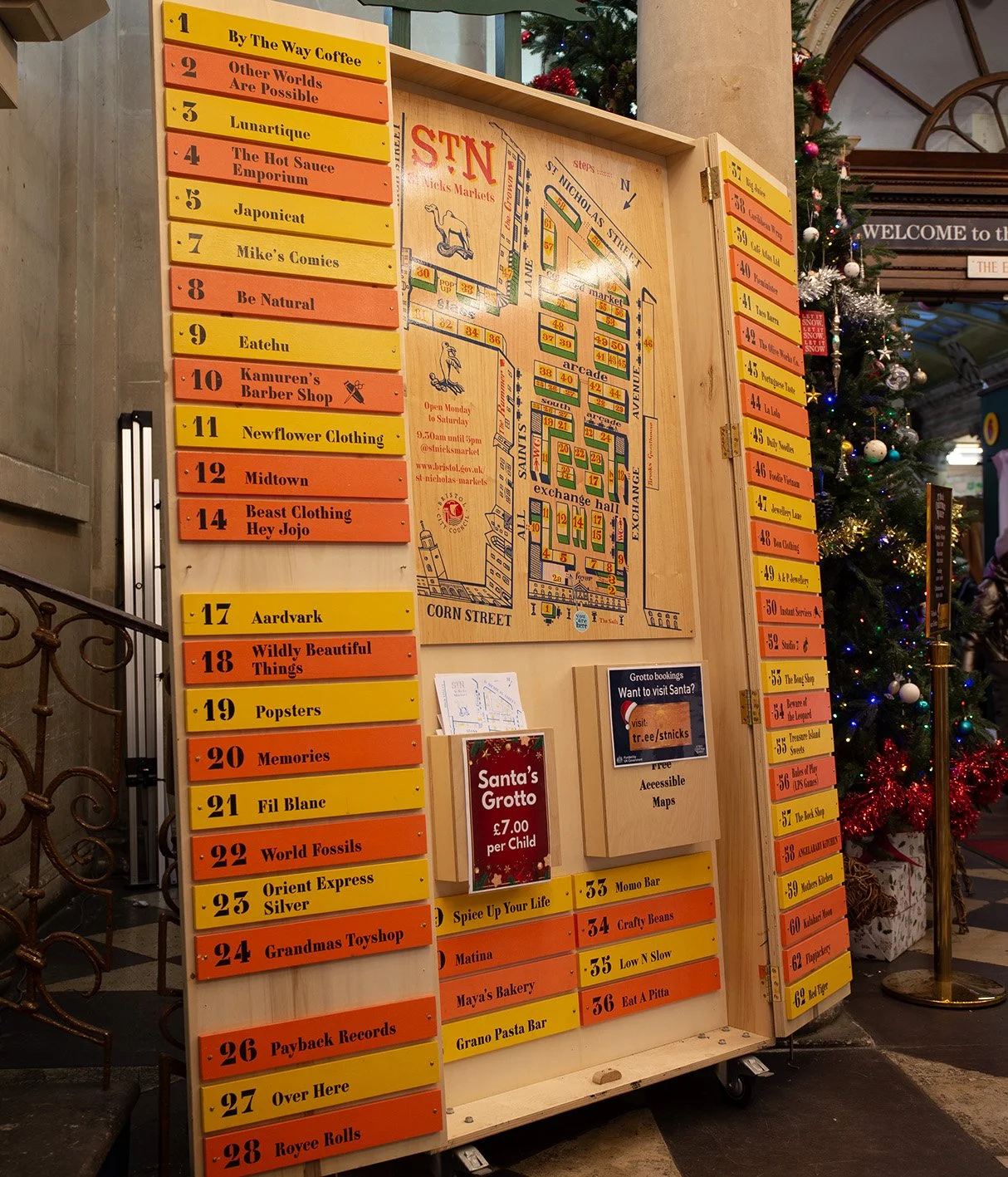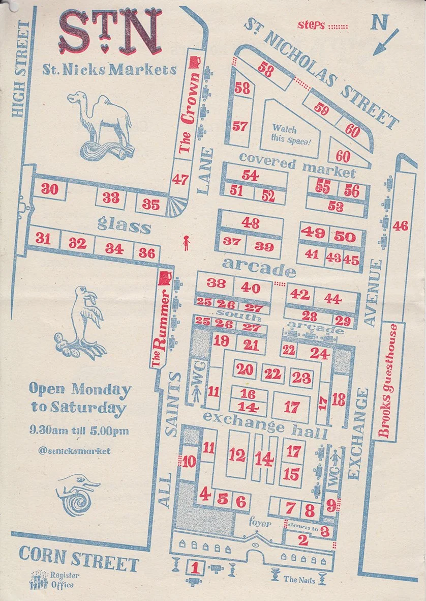 The idea was to help give the market its own look and feel and wayfinding system. Mostly adopting existing material such as the beautiful parish boundary mark carved into the wall, or the four corners of the world animal illustrations above the four door entrances to the Exchange hall. Also we found some old sack trucks in the basement which were adapted to serve as stall lists by the market entrances. The stall number signs were hand-painted by the legendary Bristol sign painter Coop. The lettering and number style we adopted some of the lovely on Bristol Tram graphics. The bright colours and letterpress work have a historic feel.